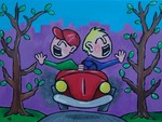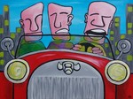 2011De door zure regen afstervende bomen worden enthousiast begroet door de twee mannen vanuit hun rokende auto… Oh wat zijn ze weer milieuvriendelijk ! Dit schilderij is gemaakt naar aanleiding van een zeker 4 jaar oude cartoon, die in de zomer van 2012 verschijnt in het studieboek LiNk! 2 (een methode Nederlands voor het tweede jaar van het secundair onderwijs).